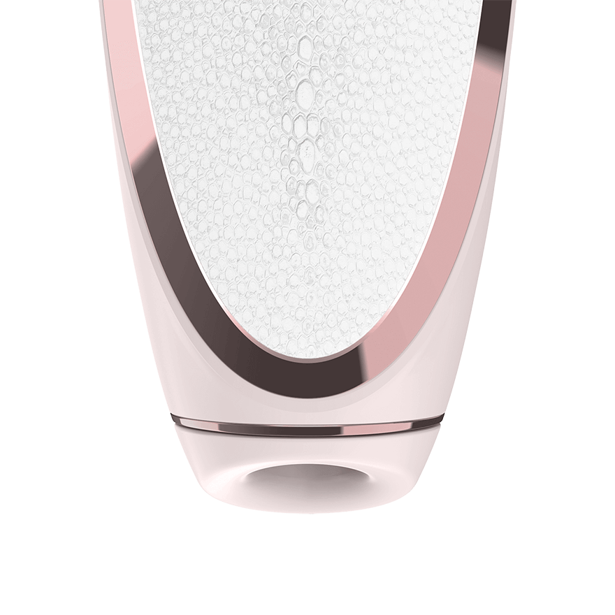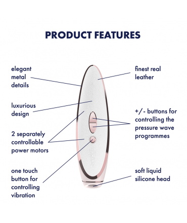 O Satisfyer Prêt-à-porter impressiona pelo seu design elegante e cheio de glamour. Equipado com um corpo em silicone mate sedoso, uma superfície em pele genuína estruturada e elegantes detalhes em metal rosa-dourado, este vibrador não impressiona apenas visualmente. Graças à sua forma ergonómica e a uma sensação tátil sensual, ele ajusta-se perfeitamente ao contorno das mãos e deleita o clitóris com a estonteante estimulação de ondas de pressão da Satisfyer.