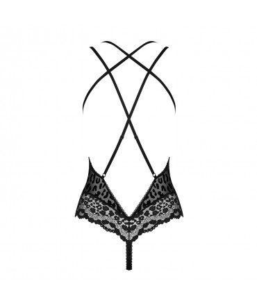 Está a sonhar com um cheiro selvagem de picante, mas também chique e elegante? O nosso novo body escaldante vai cumprir hoje todas as suas fantasias selvagens! O belo padrão e o preto intrigante criam uma combinação extremamente eficaz. Acrescente-lhe um pouco de renda e um corte tentador, e terá uma receita para uma noite divertida.Veja como é único:- sedutor body com um corte clássico- alças ajustáveis cruzadas nas costas com cintas elásticas - uma solução especial para o ajuste perfeito- tecido translúcido com um estampado com padrão de animal em veludo- enfeites de renda nas extremidades e busto- pendente metálico entre os seios - look tentador- body preso na virilha- material elástico e agradável ao tacto (94% poliamida, 6% elastano)