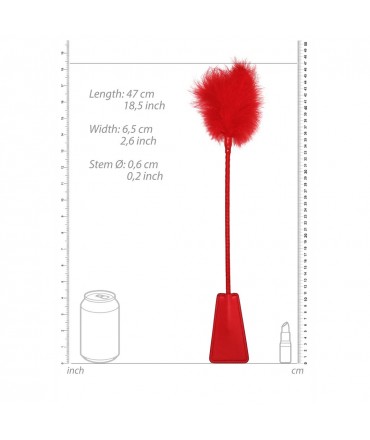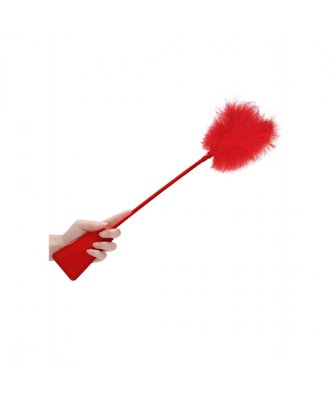 Tickler com chibata Ouch! em preto ou vermelho. Suave e intenso, combina penas delicadas e ponta firme para jogos de BDSM elegantes e sedutores.