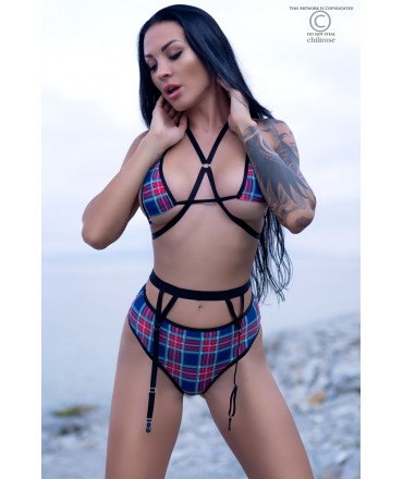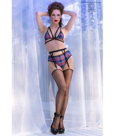 Magnífico conjunto em xadrez, composto por sutiã com alça de pescoço com pequenas copas triangulares, arnês superior, cuecas clássicas, bonito cinto de ligas e magníficas meias de ligas de rede. As alças do pescoço e das costas do sutiã, juntamente com a tanga e arnês ajustáveis, garantem um ajuste perfeito.Produto de alta qualidade embalado em uma elegante caixa.Composição: 90% poliamida, 10% elastano.
