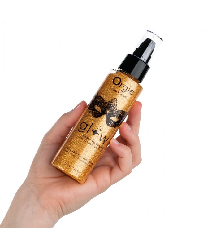 Óleo corporal Orgie com brilho dourado e hidratação intensa. Pele sedosa, luminosa e irresistível.