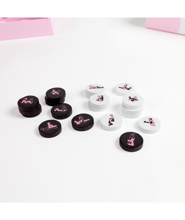 42 fichas (21 pretas + 21 cor-de-rosa), cada uma com uma posição Kamasutra diferente