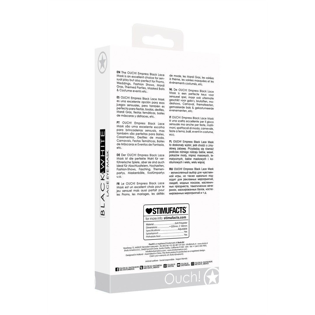 As suas fitas de qualidade garantem fixação confortável e ajuste perfeito, permitindo longas horas de uso — seja em jogos sensuais ou em eventos sofisticados. Uma peça versátil que tanto acrescenta provocação ao quarto como glamour a qualquer baile de máscaras.