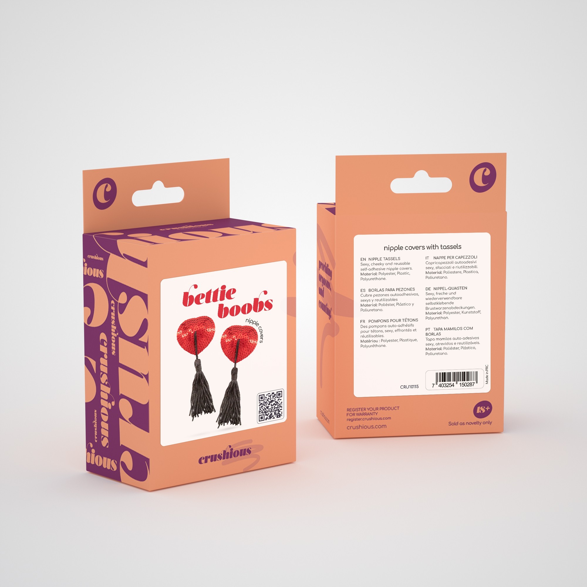 Transforme-se na maior sedutora de todo o sempre!Os tapa mamilos com borlas da Crushious estimulam não só os sentidos mais carnais do seu par como despertarão a Mata Hari que tem escondida dentro de si!Com um pouco de treino pode girar as borlas e oferecer uma sessão de burlesco privada.Sendo usados em mamilos livres de óleos ou cremes, terão um tempo de uso maior para que possa deslumbrar mais vezes.Conjugue-os com uma peça de roupa transparente e garanta que todos os olhares se prendem em si e na sua audácia!Os tapa mamilos Bettie Boobs são autoadesivos, reutilizáveis e o seu tamanho adequa-se à maioria dos mamilos.Diâmetro: 5 cm.Recomendamos que guarde os seus tapa mamilos juntamente com a película protetora fornecida para manter as propriedades adesivas.