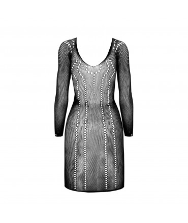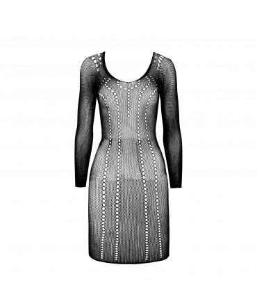 Este vestido combina sofisticação e sensualidade numa peça que não passa despercebida. O padrão elegante de pontos acrescenta charme, enquanto as mangas inovadoras, que se prendem delicadamente ao dedo, criam um efeito envolvente e irresistível.
